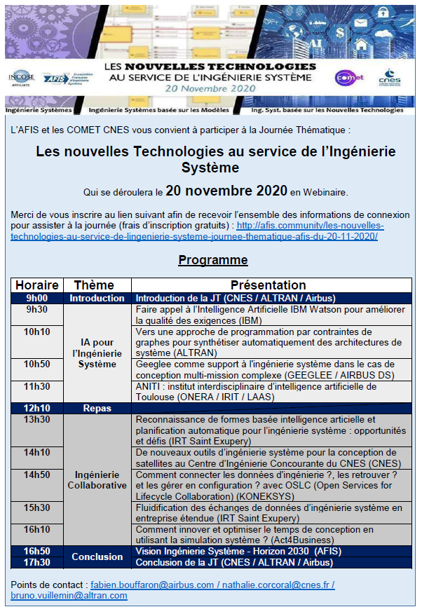 Les inscriptions gratuites sont ouvertes sur le site de l'AFIS : http://afis.community/les-nouvelles-technologies-au-service-de-lingenierie-systeme-journee-thematique-afis-du-20-11-2020/